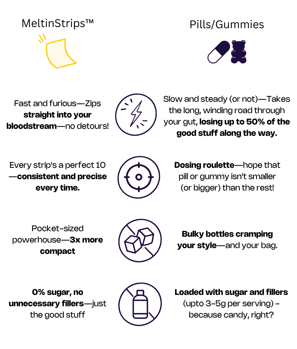These tiny but mighty strips melt on your tongue and deliver active ingredients straight to your bloodstream - 5x faster