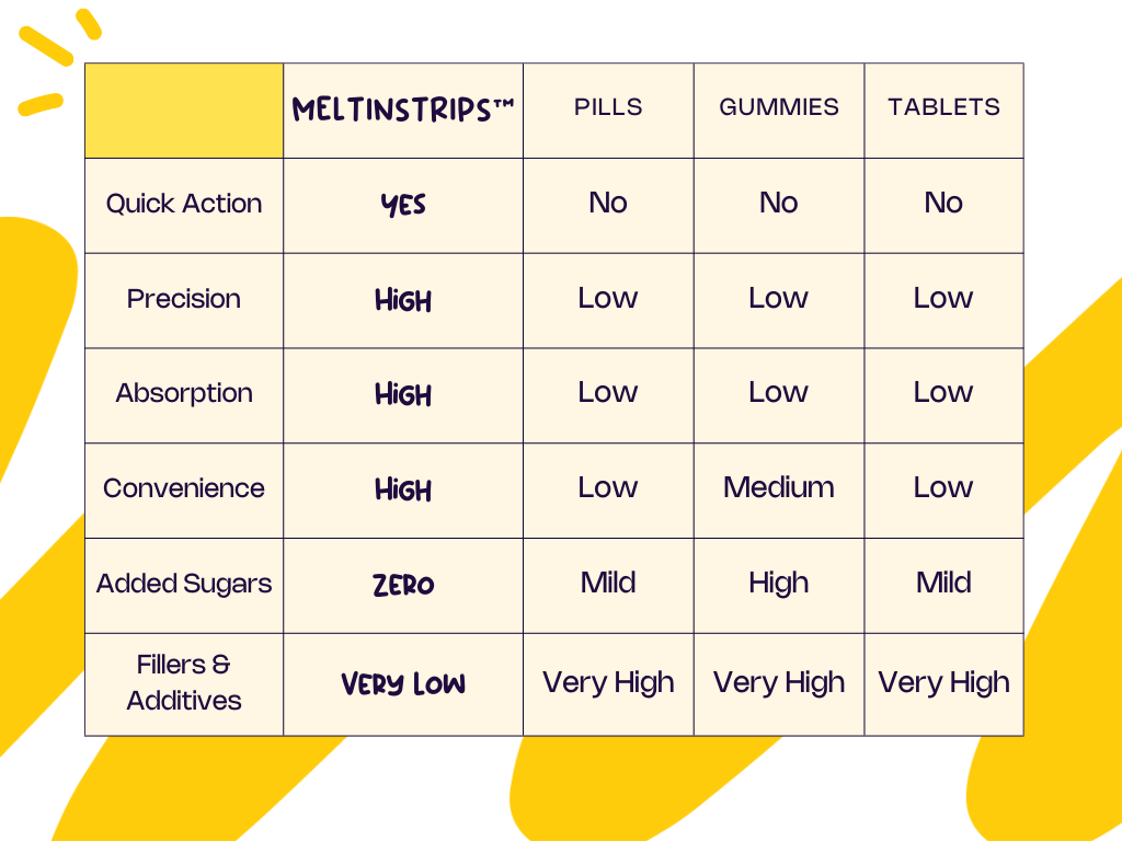 MeltinStrips™ is all about raising the bar on quality and effectiveness! With our speedy-dissolving strips and patented technology, we make sure those precious nutrients stay stable and protected, ready to give you a quick and easy boost whenever you need it. Efficient, convenient, and oh-so-effective!